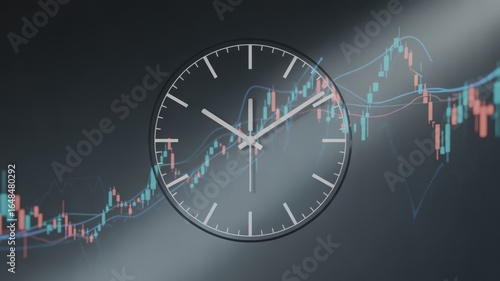 stock market visual metaphor concept. Financial growth concept with a clock overlaying stock market graphs.