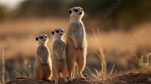 Vivid wildlife scene featuring alert meerkats in natural habitat with group behavior social mammals outdoor environment sunny weather and desert landscape