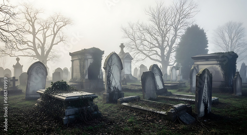 A foggy graveyard with old tombstones and trees in the background creating a spooky atmosphere ai generated