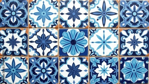 Azulejos de cerámica marroquí pintados a mano en varios tonos de azul, desde azul cielo hasta azul marino, y tonos blancos nítidos, con intrincados patrones florales