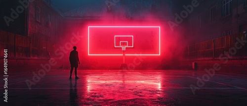 Neon Night Basketball: A solitary figure contemplates a glowing basketball hoop under a crimson sky in an urban setting.