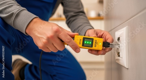 Wideangle view of an electrician finishing GFCI outlet installation with tester in hand ensuring peace of mind for home safety.