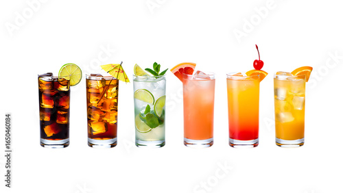 Six Colorful Refreshing Cocktails: High-Resolution Studio Shot, Vibrant Summer Drinks, Tropical Mood.
