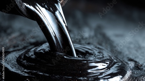Liquid Black Gold: An up-close capture of a dark, viscous liquid flowing smoothly, symbolizing industry and energy, with ripples suggesting potential