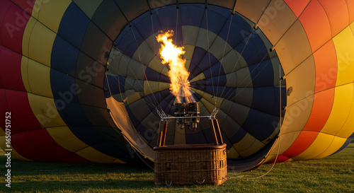 Close-up of a vibrant hot air balloon moments before liftoff, showing detailed fabric, wicker basket, and burner flame.