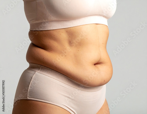 Close-up of woman body with belly fat folds. Concept image for weight loss, health, fitness, and body care
