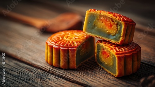 Traditional Chinese mooncakes with intricate designs and colorful fillings on rustic wooden surface