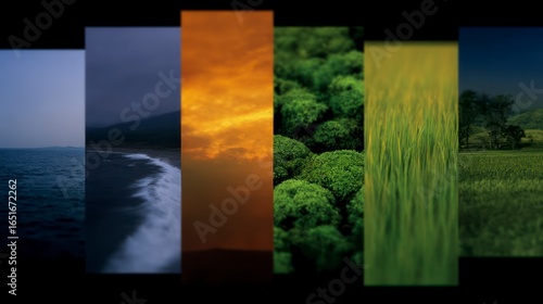 Abstract montage of diverse natural elements ocean waves sunset sky moss grass and rural landscape