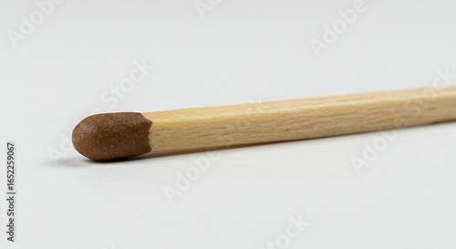 Close-up of a single wooden match with a brown tip on a white background, isolated with a shallow depth of field
