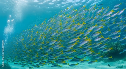 A large school of yellowtail snappers swims together in clear blue ocean water with a scuba diver in the background.
