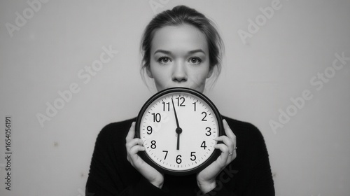 A young woman holds a large clock close to her face, emphasizing the passage of time. The image is in black and white, creating a dramatic mood.