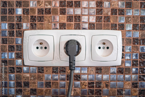 gniazdko elektryczne z podłączoną wtyczką na tle mozaiki