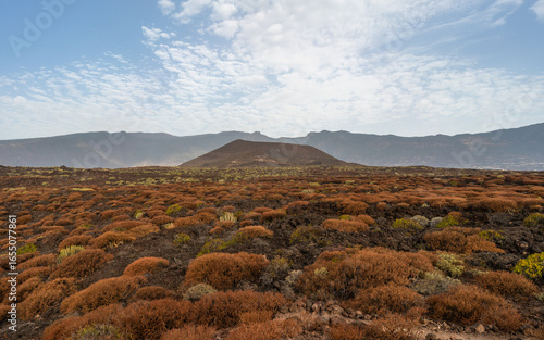 Starzec kanaryjski (Kleinia neriifolia) endemiczny sukulent wysp Kanaryjskich u podnóża stożka wulkanicznego, Malpaís de Guimar, Teneryfa, Wyspy Kanaryjskie