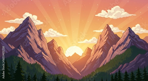 壮大な山脈 夕焼け空 鮮やか色彩 穏やか自然風景. AI Generated
