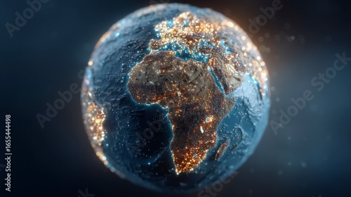 Close up view of Earth's surface at night illuminated by city lights and subtle glowing atmosphere