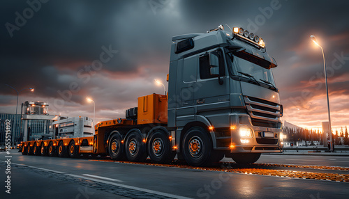 Heavy trailer truck with multiple wheels on weighing procedure on a road. Cargo transport vehicle being checked for weight regulations. Logistics, trucking industry, and commercial shipping service.