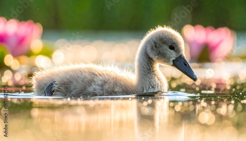 Fluffy swan cygnet swimming in pond