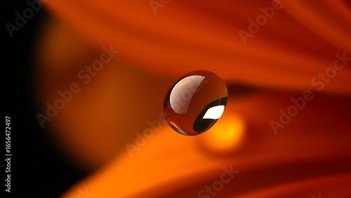 An extreme close-up of an orange flower petal with a water droplet, revealing delicate refractive details.