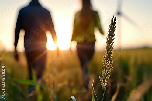 Silhouettes of couple walking through wheat field at golden sunset with grass stalk in foreground focus, romantic countryside atmosphere for lifestyle design.