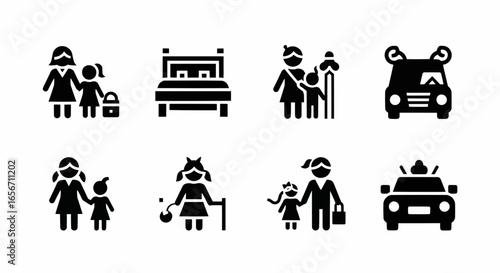 Family and parenting icon set with parents, children, car, elderly, hospital bed, and care support in solid black vector illustration.