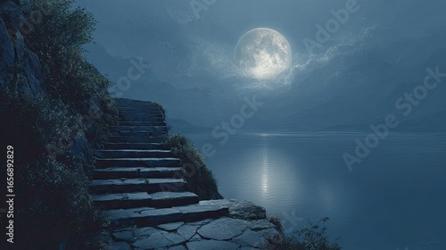 A staircase emerging from a tranquil lake leading up to the face of the full moon, serene blues and silvers, dreamlike and poetic