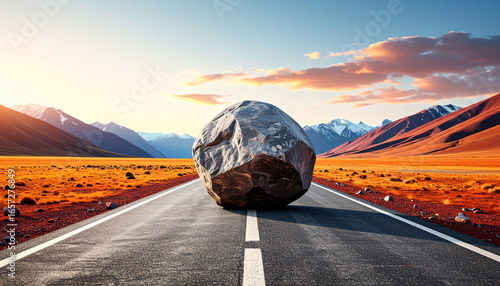 The Roadblock: A solitary boulder obstructs the path, symbolizing challenges, obstacles and hurdles that stand in the way of reaching a goal, set against a backdrop of an open road and a dramatic sky.