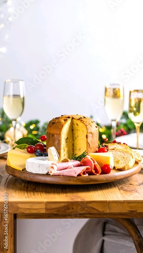 Gourmet Christmas appetizer board with Italian sweet bread, charcuterie, cheese, and sparkling wine for a festive celebration.