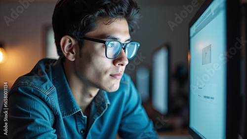 A young man wearing glasses stares intently at a computer screen. The computer screen reflects in the lenses of his glasses.