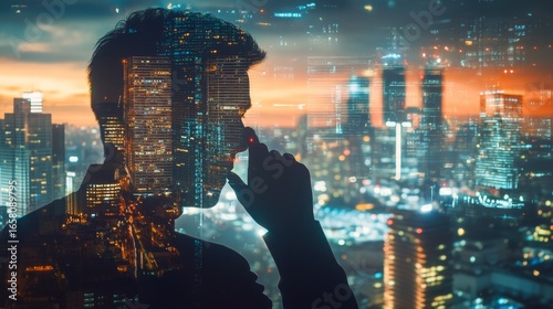 A thoughtful and contemplative man is deeply reflecting while gazing at a busy city scene filled with vibrant lights