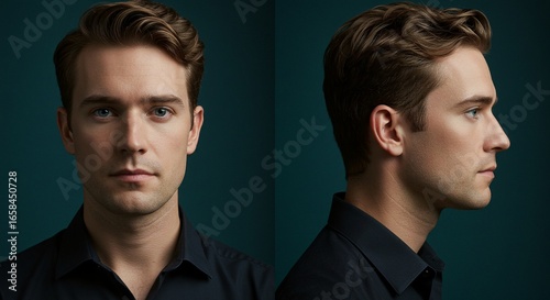 A well-groomed man with striking blue eyes poses against a dark teal background, showcasing both a front and side profile.