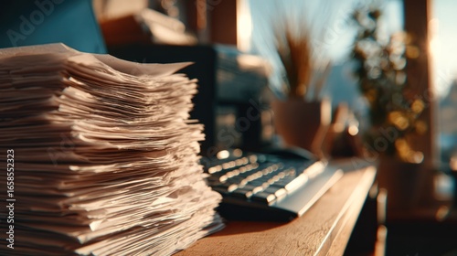 Stack of paper beside keyboard with blurred background showing sunny window