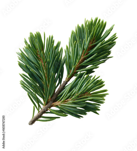 Close-up of a fresh pine branch with vibrant green needles. Two sprigs radiate from a central stem, showcasing the delicate structure of the evergreen foliage