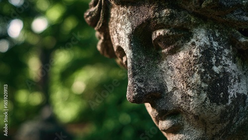 Weathered stone statue of a woman's face, serene expression, lush green background