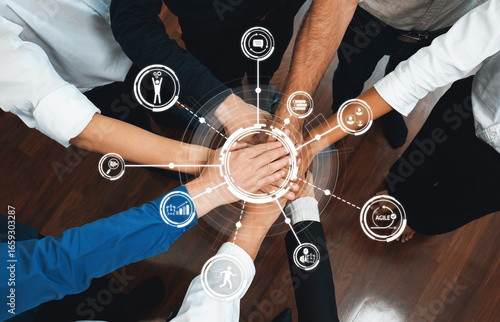 A diverse group of individuals unite their hands in a collaborative setting, surrounded by innovative technology icons symbolizing teamwork and modern business strategies. Amity