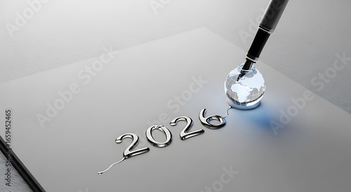 Silver 2026 numbers embossed on textured paper with a pen tip approaching for new year planning 2026 trend