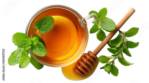 wellness tea flat lay, herbal tea cup with mint leaves and honey