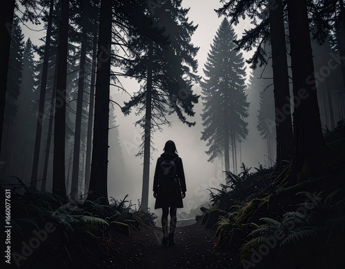 Kobieta z plecakiem na plecach idąca ścieżką przez ciemny i zamglony las