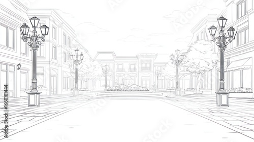 Outline illustration depicting a quaint town street with lamp posts and shop buildings