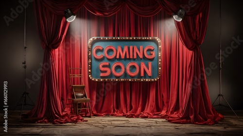 Meticulously crafted theatrical stage design with bold red curtains and dynamic retro show sign conveying imminent artistic flair