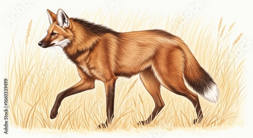 Illustrated maned wolf in natural habitat walking through tall grass
