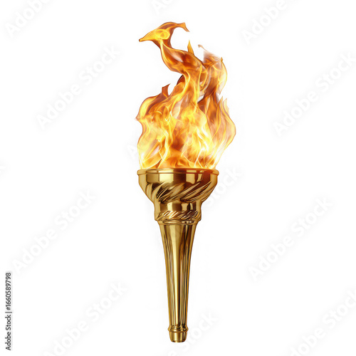 Golden olympic torch with burning flame isolated on transparent background, a symbol of competition, sport, and ancient tradition, representing victory and triumph