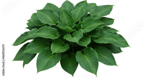 Lush green hosta plant with broad leaves thriving in a natural garden setting isolated on white background