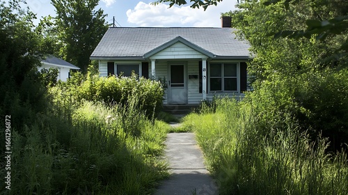 Quaint home obscured by overgrown grass along pathway leading to front door