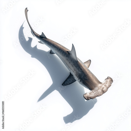 Hammerhai freigestellt auf weißem Hintergrund – Draufsicht mit Schattenwurf; maritimes Wildtier, Meeresraubtier und Knorpelfisch – minimalistische Studioaufnahme mit Textfreiraum