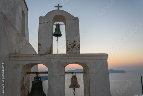 Church Bell Tower at Sunset Overlooking the Sea in Fira, Santorini, Cyclades, Greece