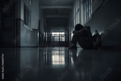 Generated by AI picture of an upset unhappy young peson suffering from depresson and bullying in dark scool corridor
