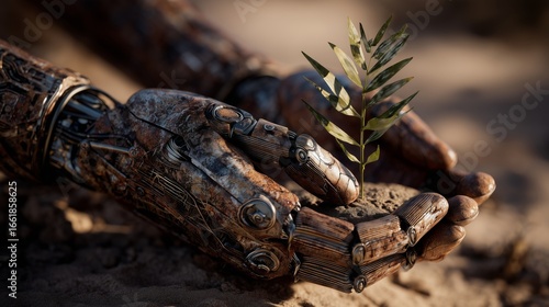 Robot hand nurtures green plant in desert landscape futuristic technology close-up view nature concept