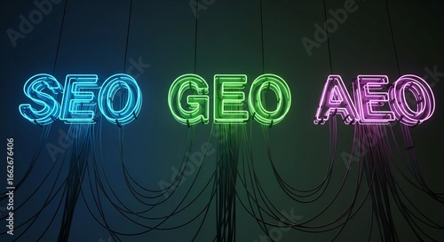 SEO, GEO, AEO Neon Signs: Digital Marketing and Technology Concepts with Vibrant Lights