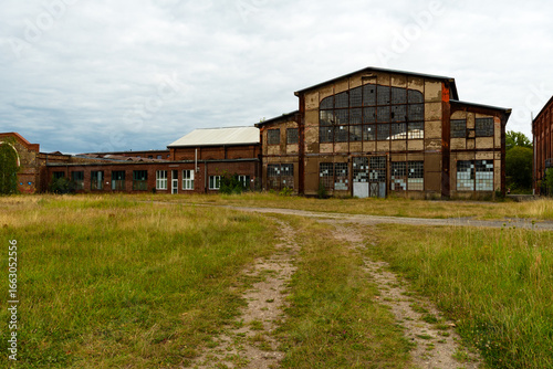 Eine alte Industriehalle mit großen Fensterfronten und verwitterter Fassade steht verlassen auf einer Wiese. Die Backsteinarchitektur wirkt wie ein Relikt vergangener Industriekultur.