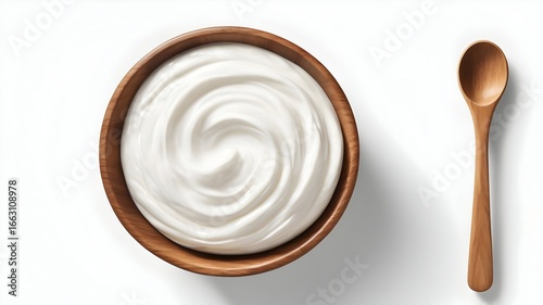 Wooden bowl filled with creamy fresh yogurt and wooden spoon healthy dairy food stock photo white background